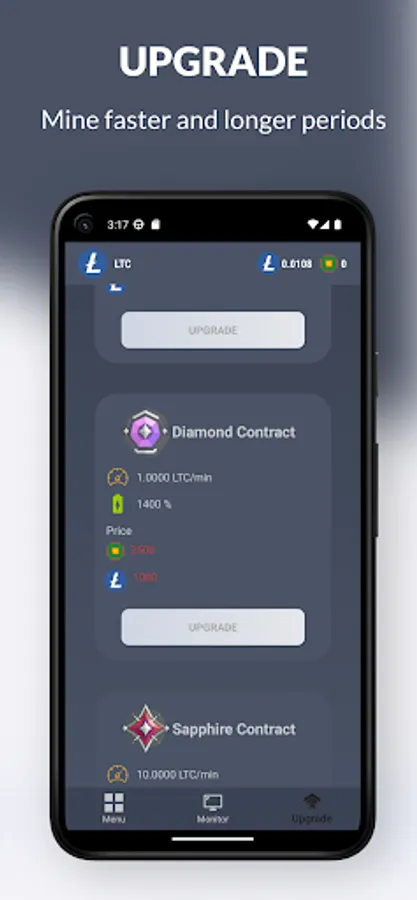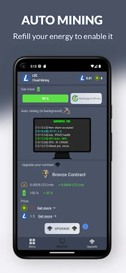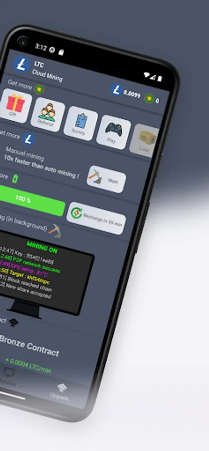 With Litecoin (LTC) mining simulation, you can track your mining progress in real time and exchange your earnings directly to your Litecoin (LTC) wallet. You can also upgrade your contract to mine LTC even faster and increase your profits. Plus, our app offers a referral program where you can earn additional LTC by inviting your friends and family to join.