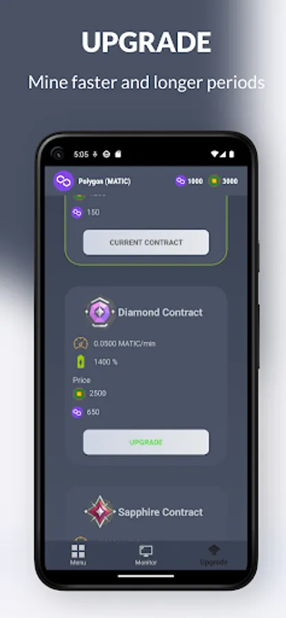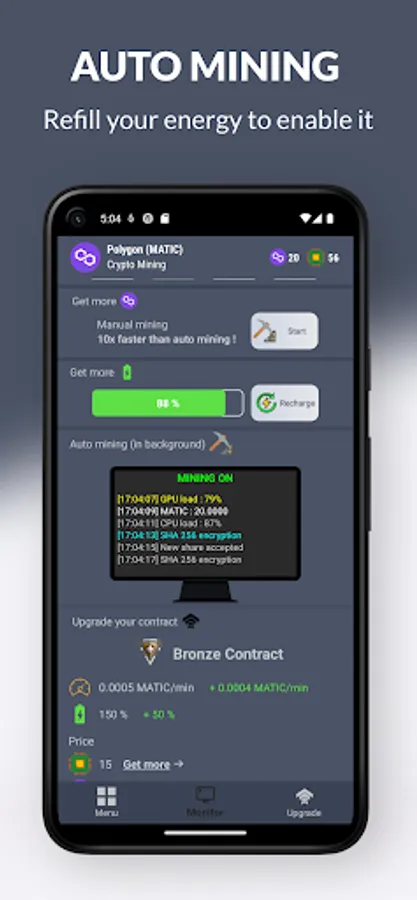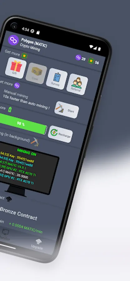 With Polygon (MATIC) Cloud mining, you can track your mining progress in real time and exchange your earnings directly to your wallet. You can also upgrade your contract to mine MATIC even faster and increase your profits. Plus, our app offers a referral program where you can earn additional MATIC and other rewards by inviting your friends and family to join.