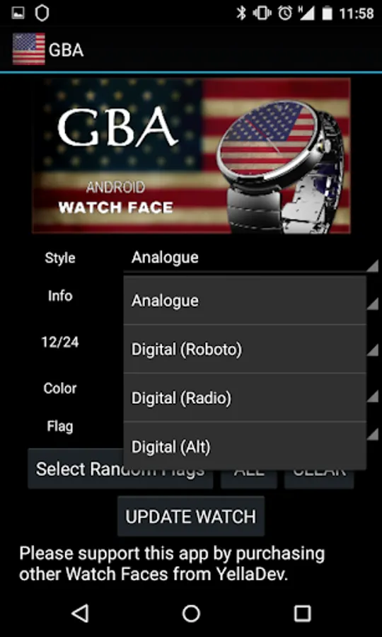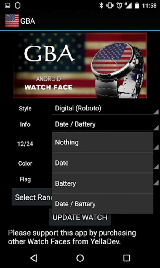 Want to be able to show off the colors of your state flag on your wrist. Nows your chance with GBA (God Bless America) watch face, you can now either show your states flag true colors, or show them all or just a selection of them.