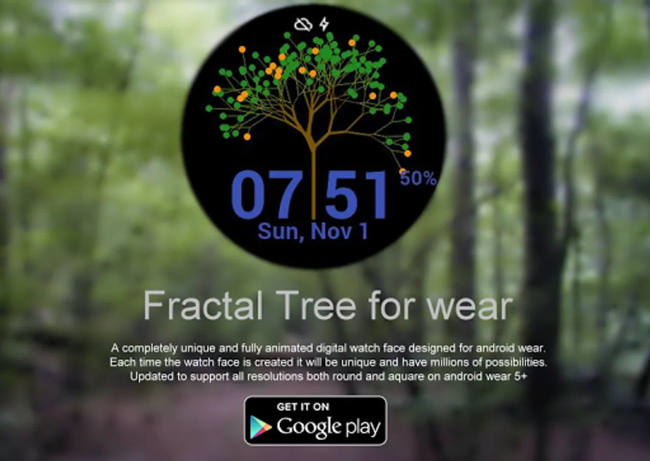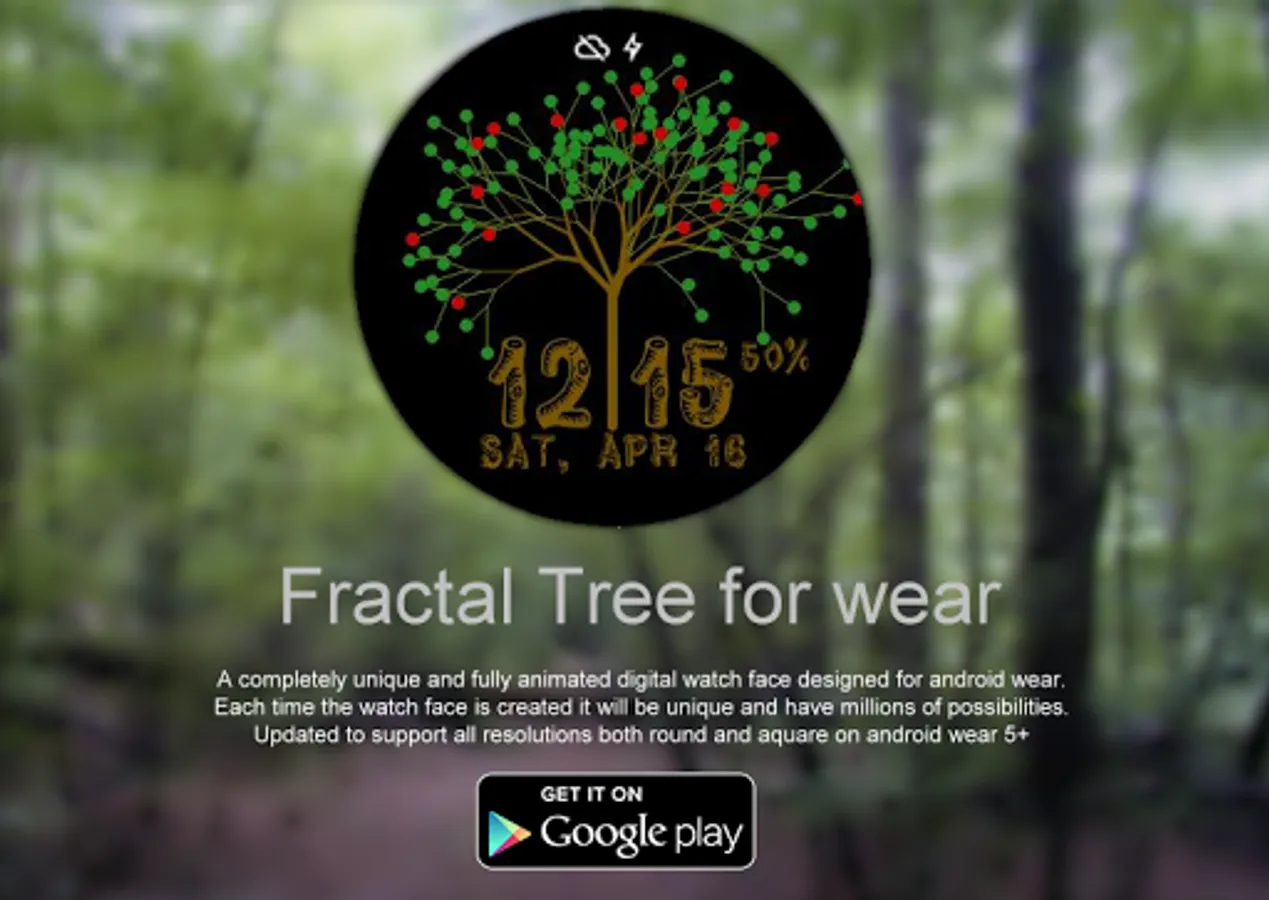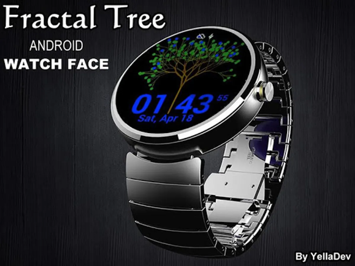ETree (Fractal Tree) watch face is a very unique and easy to use digital watch face designed for Android Wear. It is a one of a kind watch face, completely unique in its creation of a Fractal Tree, using the process of recursion with random values meaning each and every time it will be different from the last, with billions of possibilities. This is no animated gif, but a true uniquely created fractal each and every time a it is created.