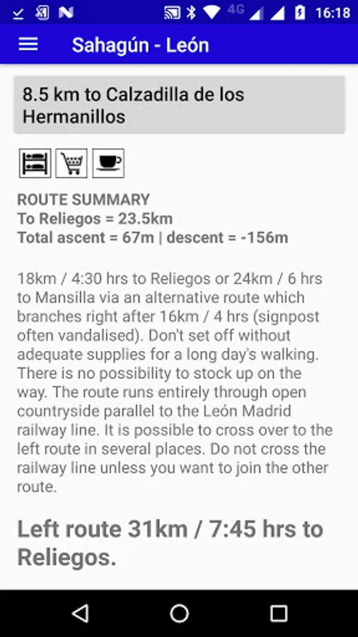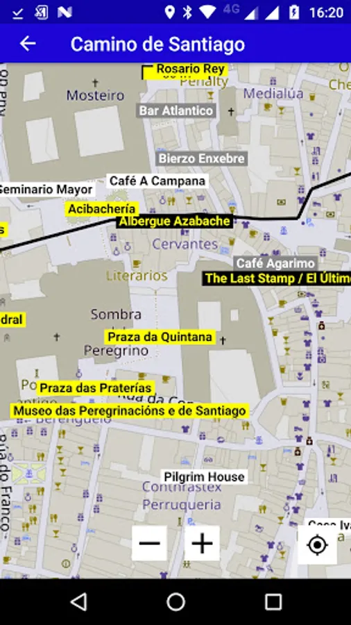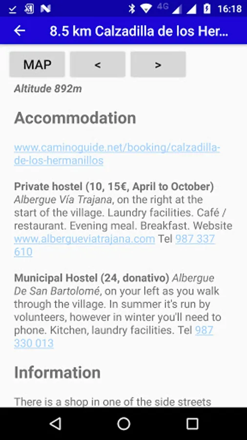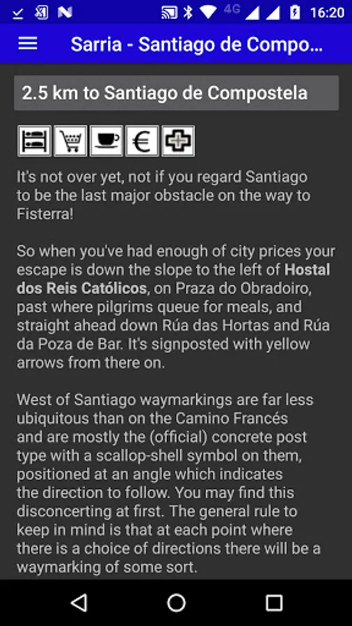 Maps: interactive, offline route maps showing the Camino in rural areas and in greater detail in cities and towns with the location of Pilgrim Hostels and other facilities.