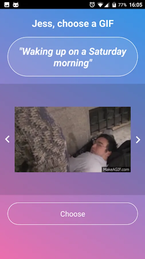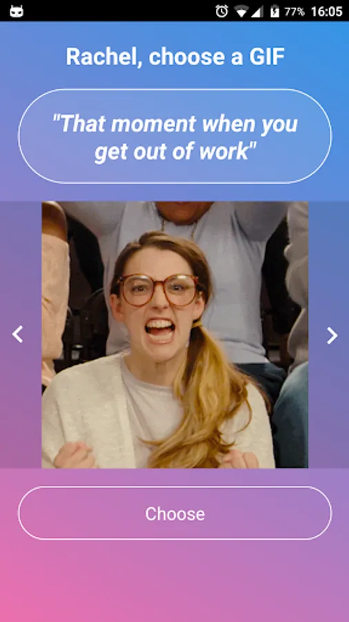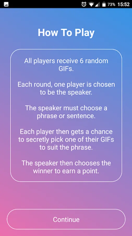 How to play: All players receive 6 random GIFs at the start of the game. Each round, one player is chosen to be the speaker. The speaker must choose a phrase or sentence. Each player then gets a chance to secretly pick one of their GIFs to suit the phrase. The speaker then chooses the winner to earn a point. Whoever earns the most points by the end of the game, wins!