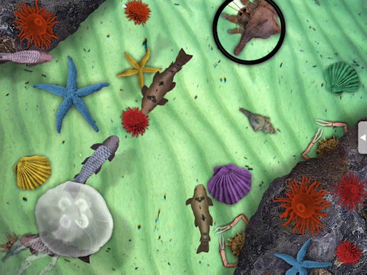 Three soothing sensory worlds to interact with. The gently rippling rock pool is alive with scuttling crabs, pulsing jellyfish and waving anemones. Explore the woodland floor to discover sliding snails, flying ladybugs and hidden treasure. Collect apples, discover wildlife and find out what else is waiting to be uncovered in the garden. Each environment can be explored as a live picture with subjects that can be selected to see how they respond. Static pictures are also available so that children can magnify parts to see details not visible in the live scene.