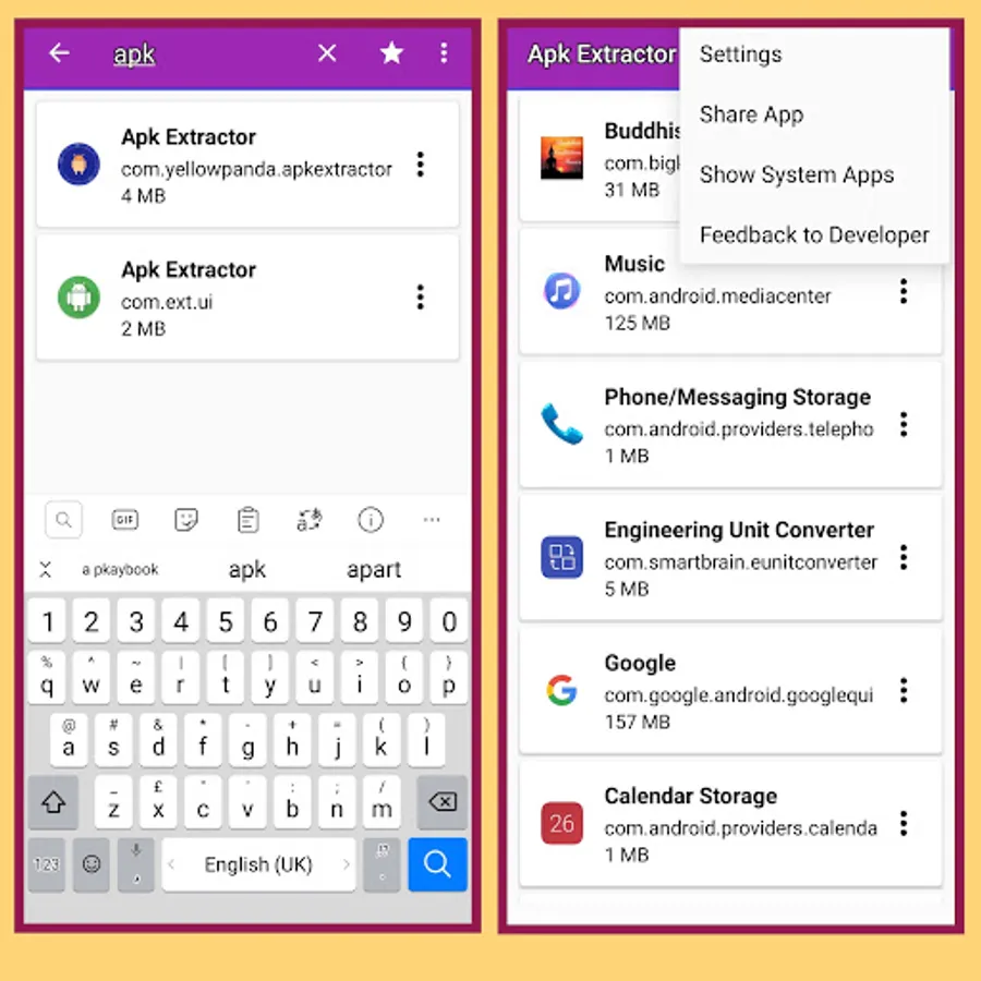 Apk Extractor is a fast and lightweight app to extract apk that are installed on your android device: