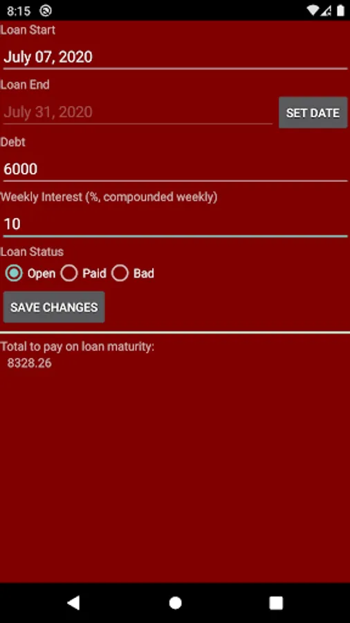 To add the details to the loan, press the "View open loan" text after you save debtor's name. Type in the loan amount and interest rate. Set the due date and this app will send you reminder to the loan.