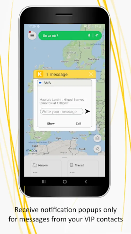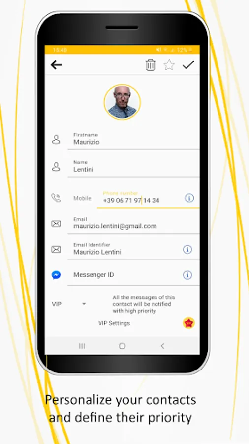 - For each contact, choice of priority level (VIP, standard, no notification) for all the notifications of SMS, WhatsApp, Messenger, Signal, Telegram, Gmail and Outlook messages received from this contact