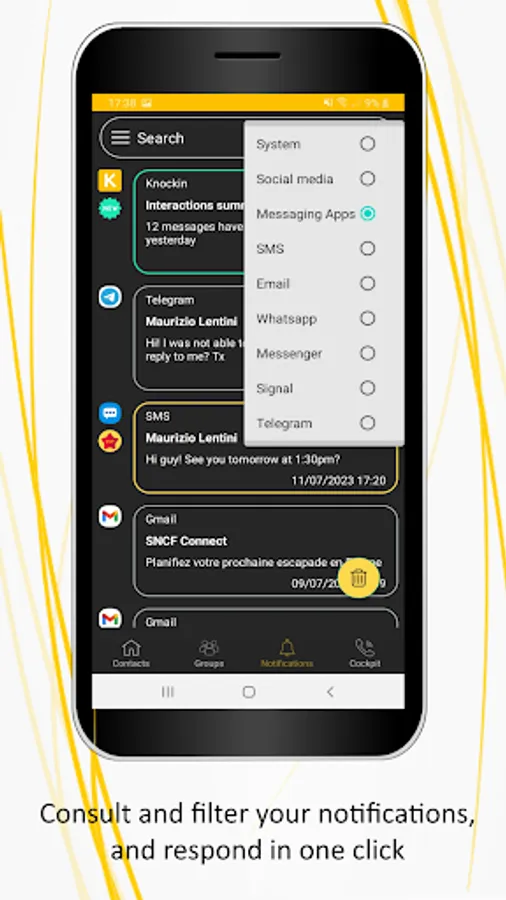 • Notifications must be activated in each of the applications concerned (SMS, WhatsApp, Messenger, Signal, Telegram, Gmail or Outlook)
