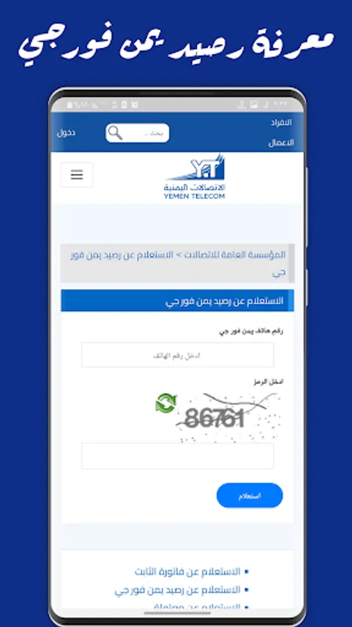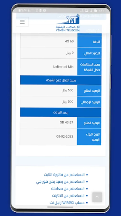 This app allows you to inquire about your account balance at (Yemen Net ADSL, Yemen 4G, Hatfi, WiMax, Aden Net),