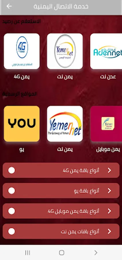 The application includes all Yemeni telecommunications companies (Yemen Mobile - Spafon - U - Yemen Net - Aden Net - Yemen Forge)