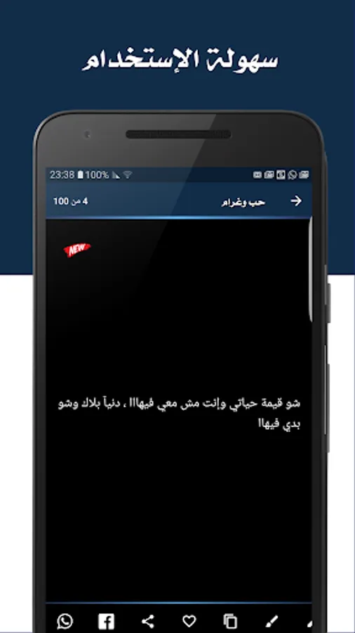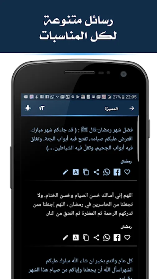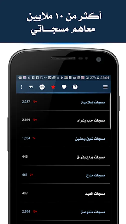 مسجاتي المطور،،، كانت ٧٠٠٠ و الأن اصبحت ٢٠ الف رسالة مسجاتي البرنامج الأكثر من رائع يمكنك من مشاركة أجمل الرسائل، المسجات و الحالات و يحتوي على أكثر من ٢٠ الف رسالة و ١٠٠ الف حالة جديدة ومتنوعة شاركها مع اصدقائك و افراد عائلتك عبر أشهر برامج التواصل الاجتماعية