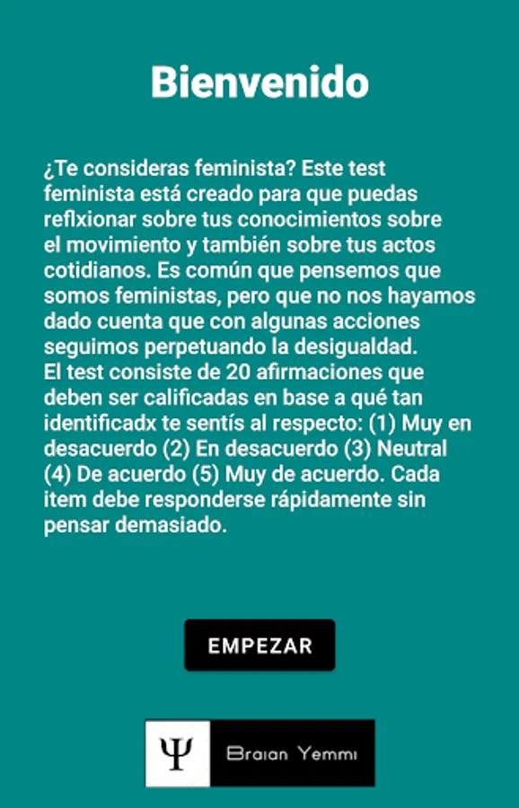 Do you consider yourself a feminist? This feminist test is created so that you can reflect on your knowledge about the movement and also about your daily actions. It is common that we think that we are feminists, but that we have not realized that with some actions we continue to perpetuate inequality. The test consists of 20 statements that must be scored based on how identified you feel about it: (1) disagree (2) slightly disagree (3) neutral (4) slightly agree (5) agree. Each item must be answered quickly without thinking too much.