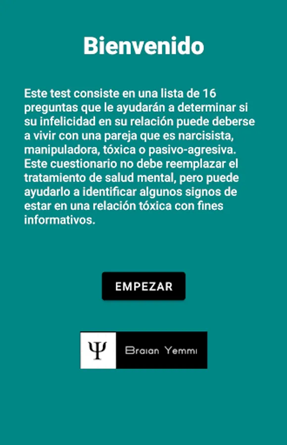 This test consists of a list of 16 questions that will help you determine if your unhappiness in your relationship may be due to living with a partner who is narcissistic, manipulative, toxic, or passive-aggressive. This questionnaire should not replace mental health treatment, but it can help you identify some signs of being in a toxic relationship for informational purposes.