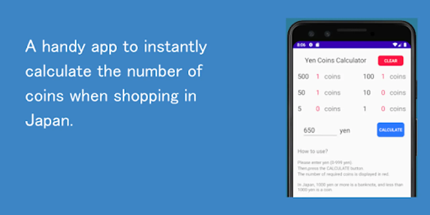 In Japan, coins are used for payment of 1,000 yen or less. There are many coins such as 500 yen, 100 yen, 50 yen, 10 yen, 5 yen and 1 yen. With this app, you can instantly know how many coins you will need when shopping.
