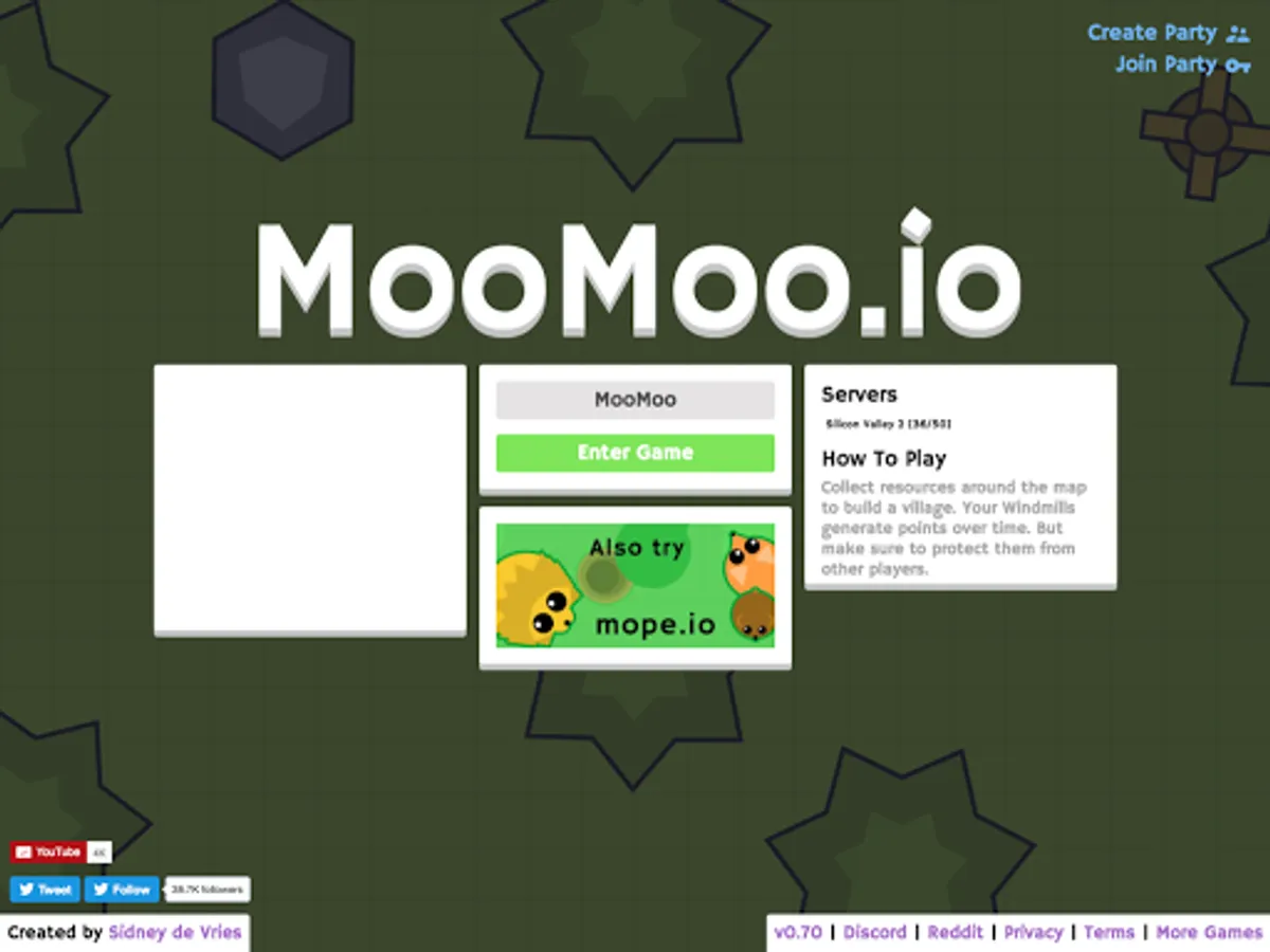 MooMoo.io Official version. Gather resources to build a base. Defend it from other players or from your friends. Join tribes and build bigger bases; together! Upgrade and Customize your Character with Hats!