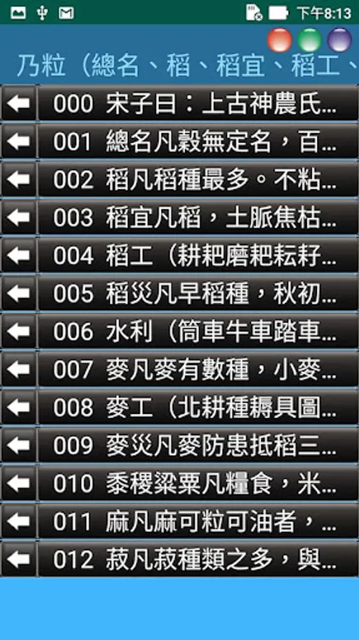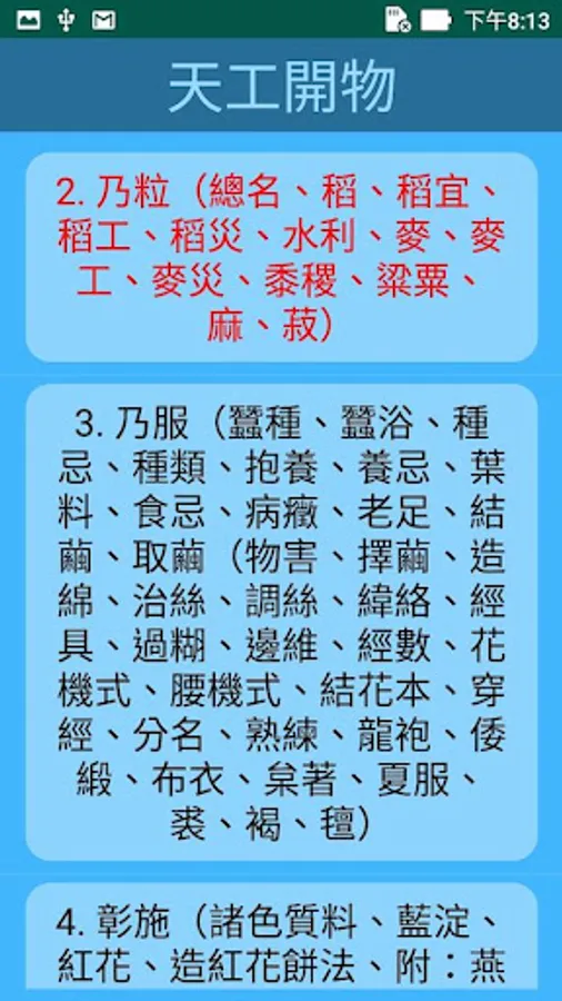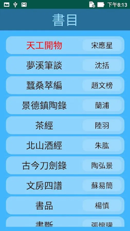 收錄書籍經典包括:天工開物、夢溪筆談、蠶桑萃編、景德鎮陶錄、茶經、北山酒經、古今刀劍錄、文房四譜、書品、書斷、法書要錄、書法離鉤、寒山帚談、歷代名畫記、圖畫見聞誌、畫史、棋經、棋訣、雲林石譜、香譜、范村梅譜、金漳蘭譜、竹譜、百菊集譜、齊民要術、農書、農政全書、水經注、徐霞客遊記、營造法式、墨子、吕氏春秋、睡虎地秦墓竹簡。