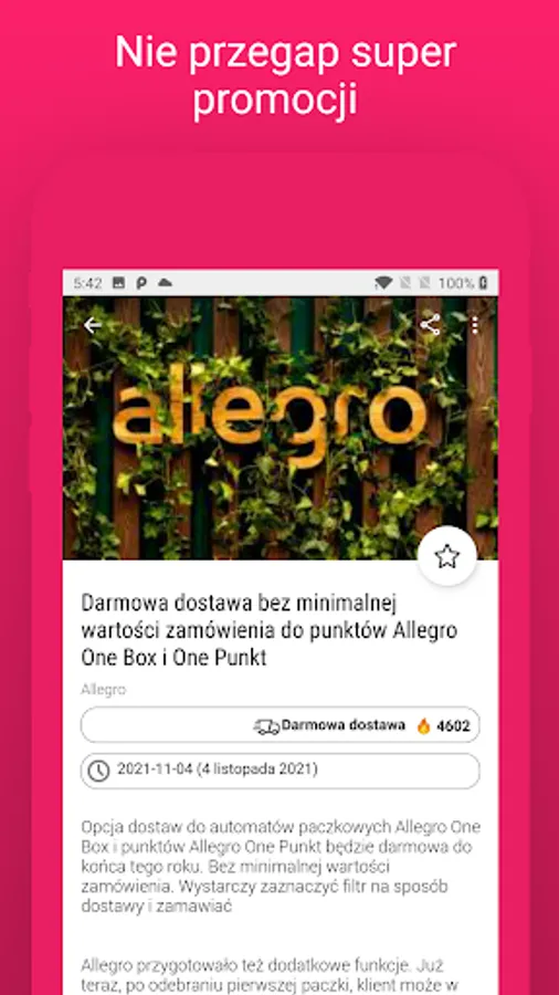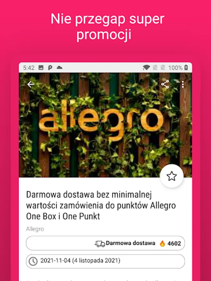 🔥 Find current coupon codes and discounts from: Allegro, Kaufland, Biedronka, Centrum, Arhelan, Skapiec, Freshmarket, Groszek, Lewiatan, Stokrotka, Grupa Chorten, POLOmarket, Selgros, SPAR, Społem, TOPAZ, Żabka, Zalando, IKEA, Bonprix, PEPCO, Textil Market, H&M, Domodi, ABOUT YOU, Orsay, KappAhl, Stradivarius, Bershka, Nokaut, Top Secret, Sizeer, Renee, Kazar, Jula and many more.