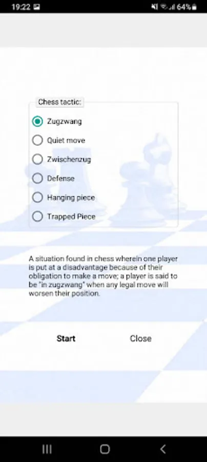 With this application you can solve thousands of chess tactic puzzles grouped by theme (Zugzwang, Quiet move, Zwischenzug, Defense, Hanging piece, Trapped piece).