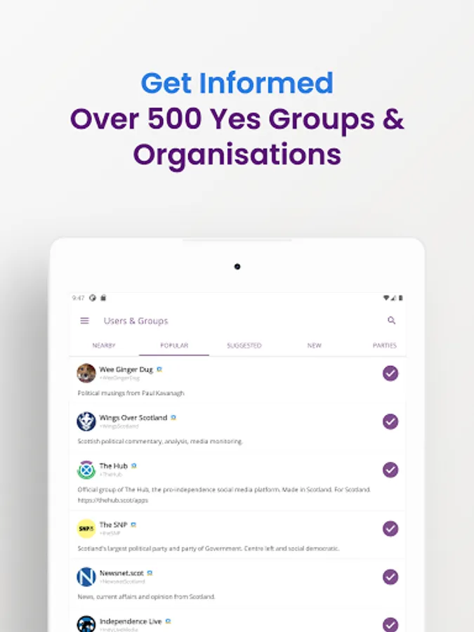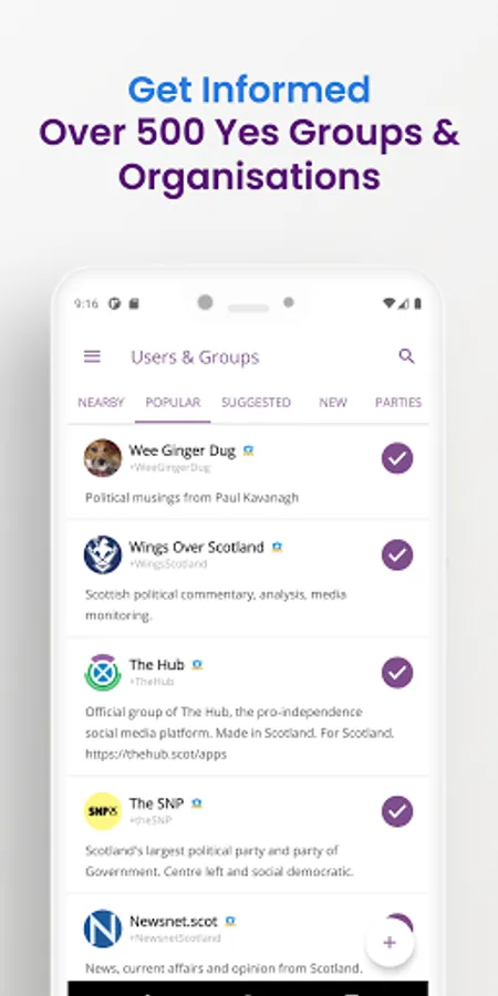 Keeping up to date with Scottish political news surround independence is now easier than ever. Follow Yes groups and get notified as soon as they post new content.
