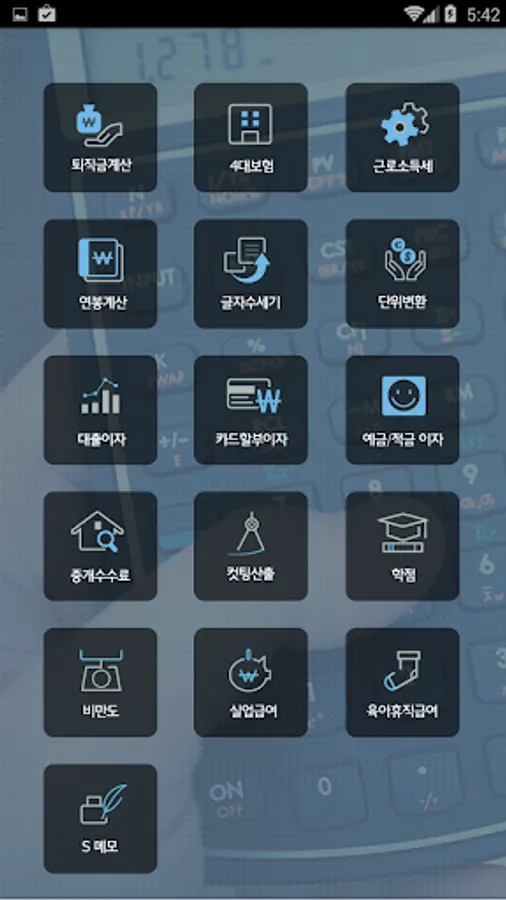 퇴직금, 4대보험, 근로소득세, 연봉계산, 글자수세기,단위변환, 대출이자, 카드할부이자, 예금/적금 이자, 중개수수료, 컷팅산출, 학점, 비만도, 실업급여, 육아휴직급여 자동계산기