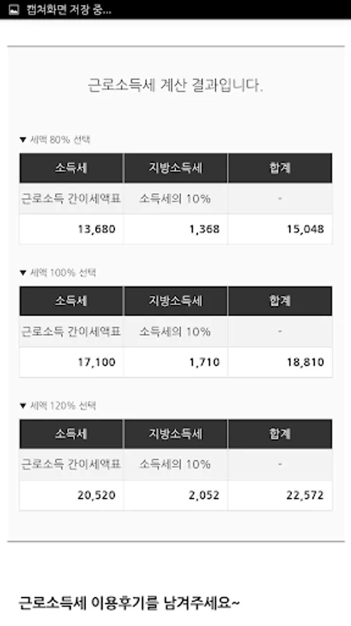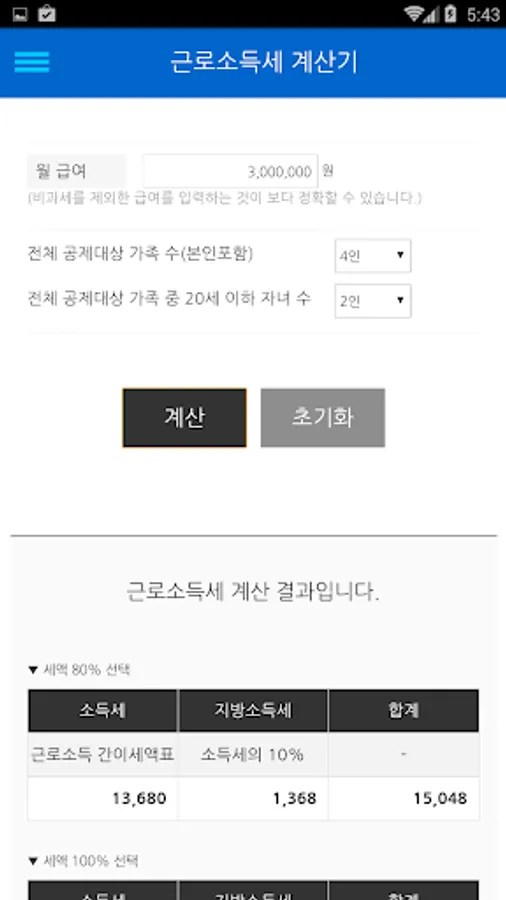 3. 근로소득세 계산 : 월 급여, 공제대상 가족 수, 20세이하 자녀 수를 입력하여 세액유형별 소득세와 지방소득세 계산