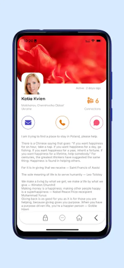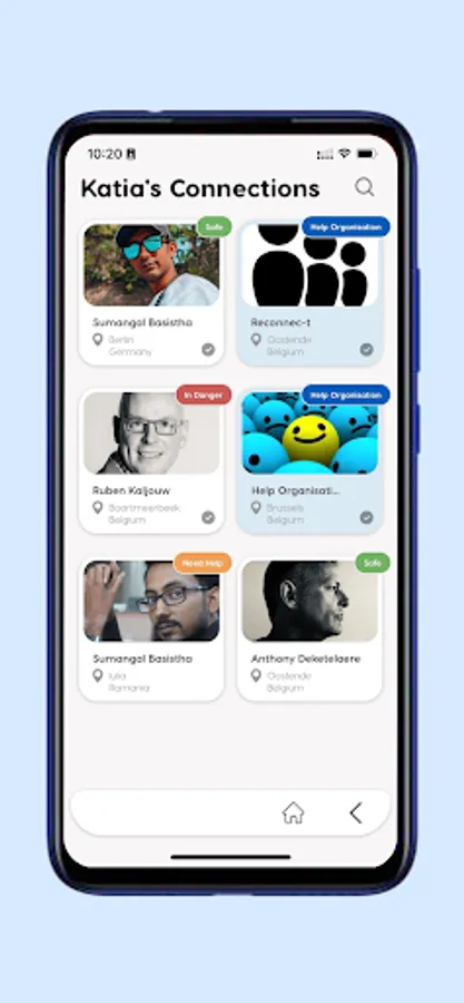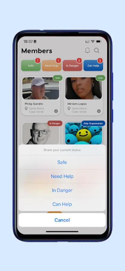 Once you signed up you can immediately login to the platform and start making connections. Your default status is set to ‘Safe’ when needed you can change to: ‘Need Help’, ‘In Danger’ or ‘Can Help’. This way you know instantly when someone is in need of your support and when they are safe again.