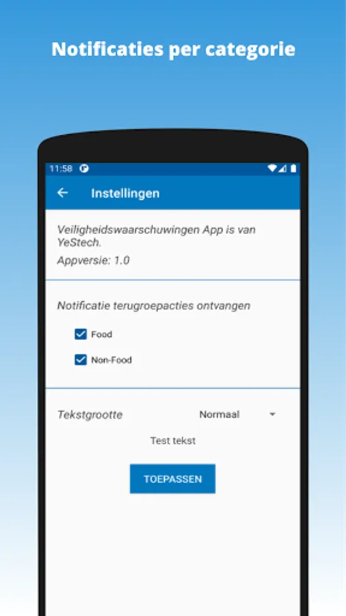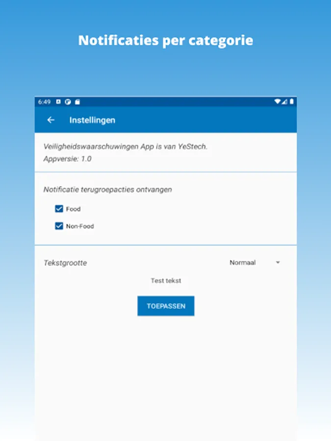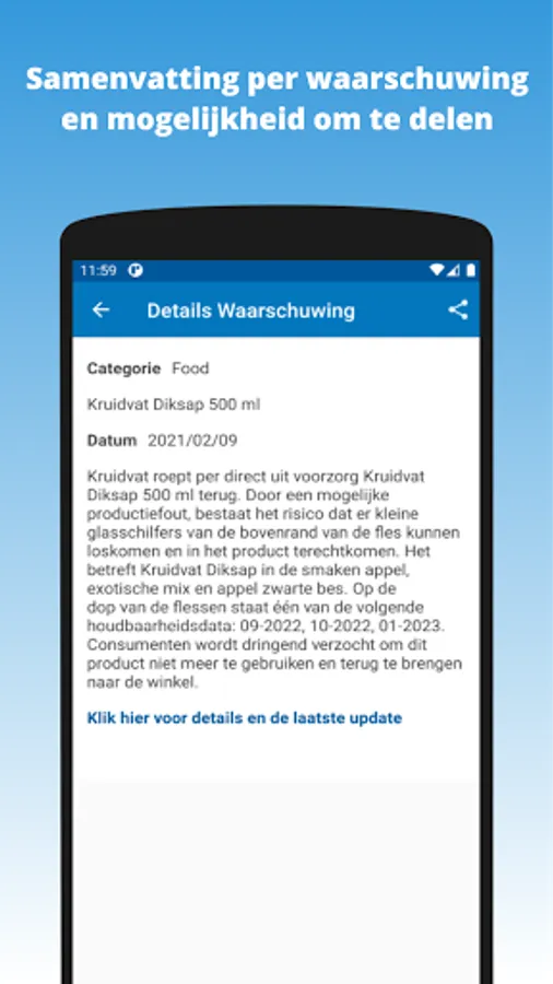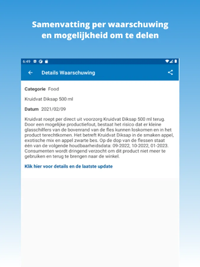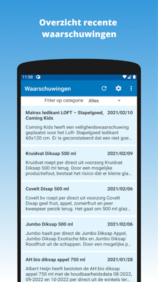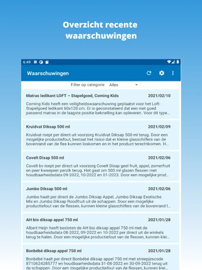 The Safety Warnings App is a free app and is intended to bundle as many recalls and safety warnings in the Netherlands as possible and to make them clear in one app. This is to support you, so that recalls and warnings can come to your attention earlier and easier. Registration is not necessary.