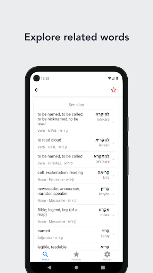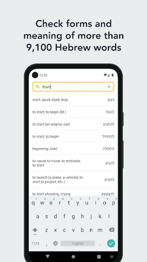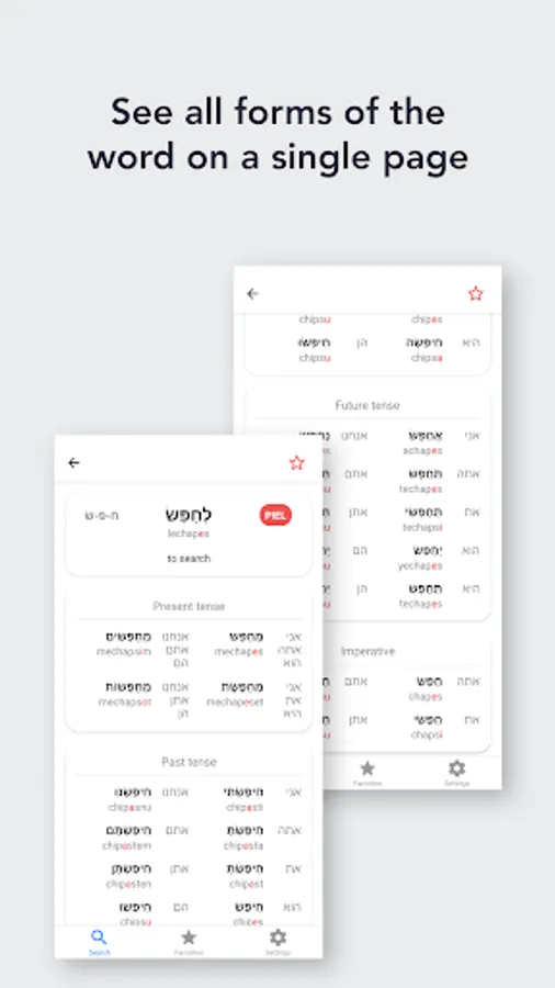 Check all forms of 9,100+ Hebrew words in a fast and straightforward mobile tool: verb conjugation tables and forms of nouns, adjectives, numerals, prepositions, etc. Ad-free.