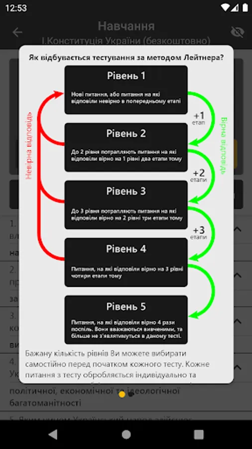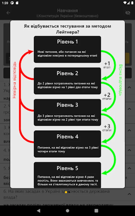 Effective study of questions is implemented by Leitner's method, which allows you to study and memorize the studied material indefinitely. This is achieved through more frequent repetition of questions by the user, in response to which he often makes mistakes.
