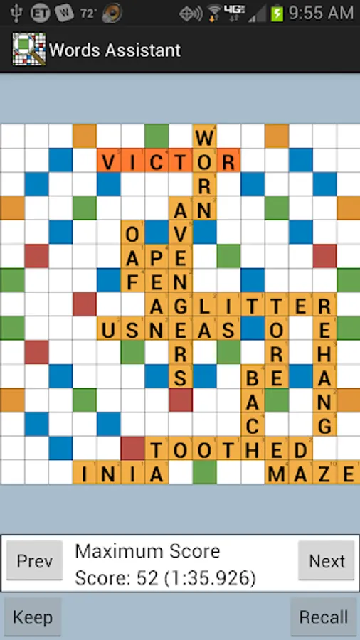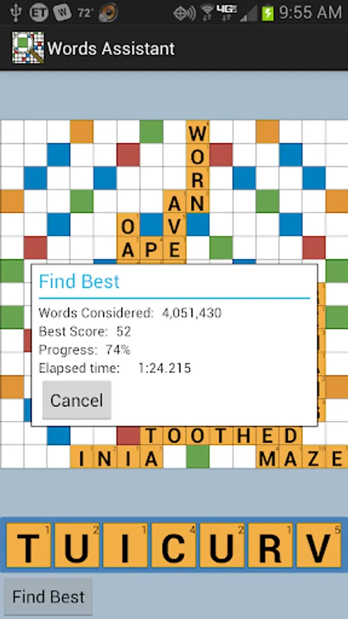 Words Assistant stores all of your games, so no need to constantly create boards. Just add your opponent's last play and your new tiles, and you're ready to click "Find Best" to find the best word for your next turn.