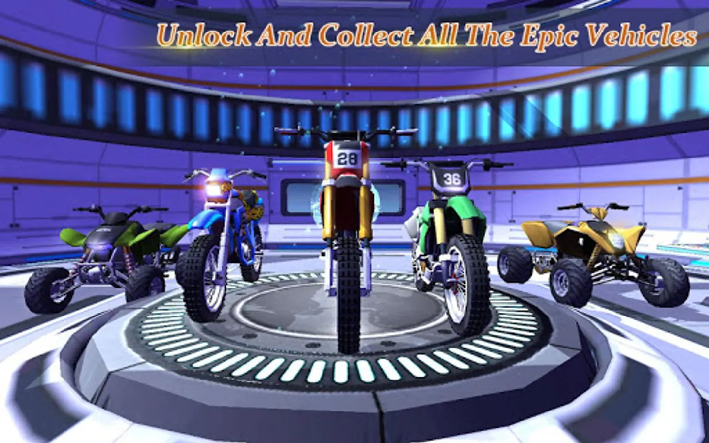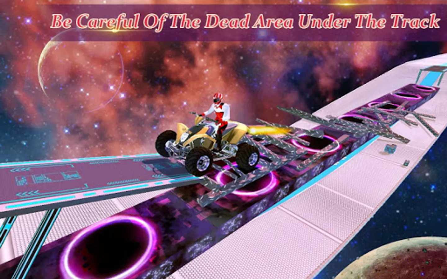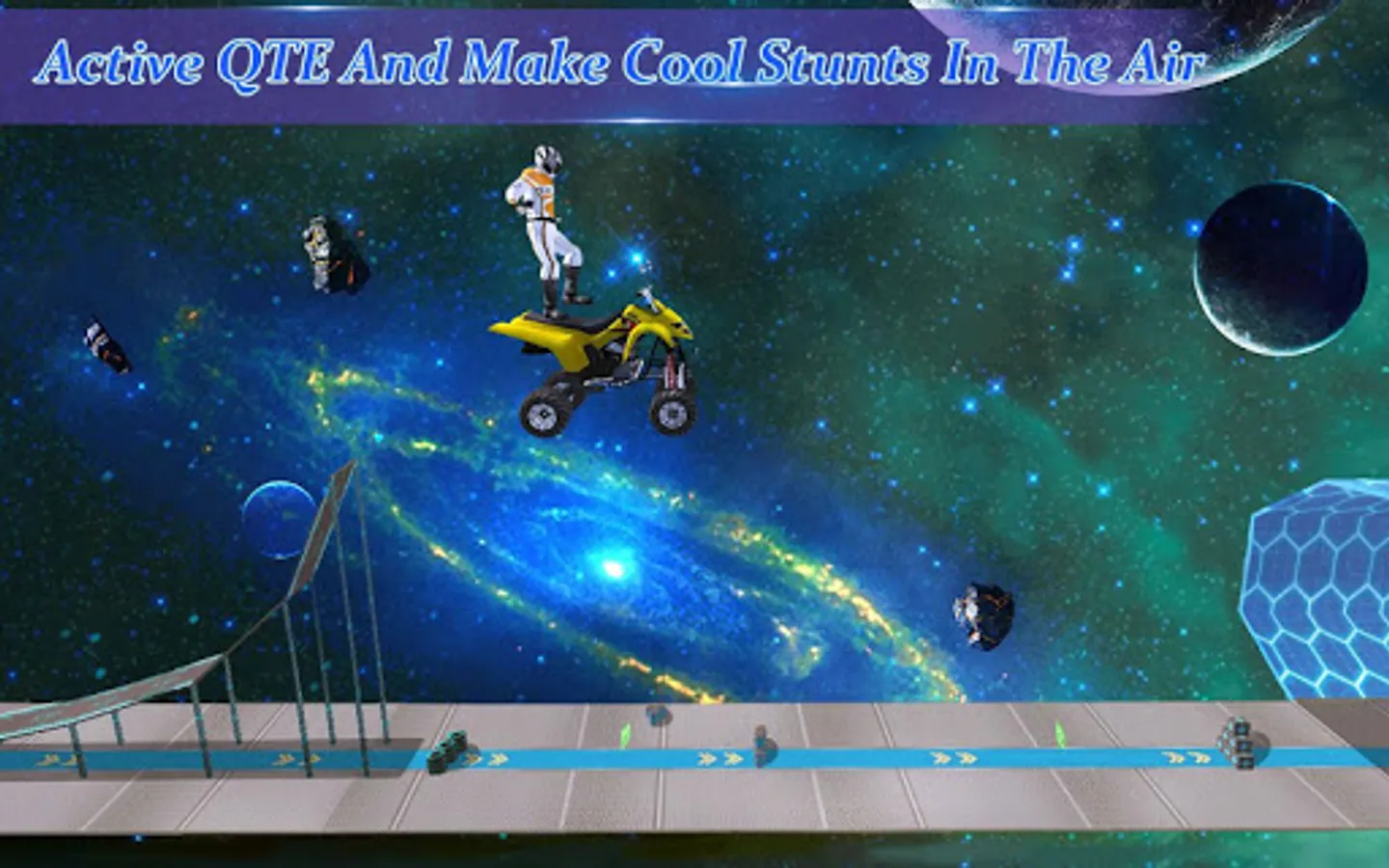 Not only will you race on the track at full speed, but also you need to make different stunts and win the title Galaxy Tricks Master. The more stunts you make, the more scores you will get. All those will happen in a realistic galaxy environment, where you can see the epic space and many stars. Against the galaxy, on the stunt tracks, you can also collect CASH and NITRO. When you have enough NITRO, you will be boosted high and have a QTE (quick touch event) time. During the QTE time, you can touch quick buttons to make different awesome stunts. Quick, quick and Quick! Good, good and perfect!