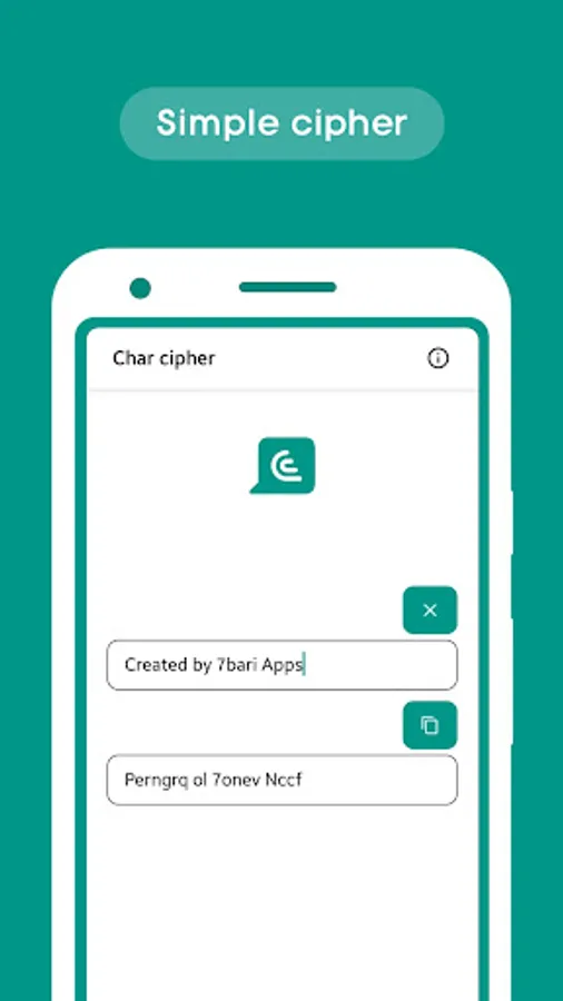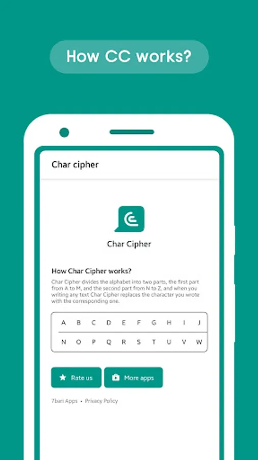 Char Cipher divides the alphabet into two parts, the first part from A to M, and the second part from N to Z, and when you writing any text Char Cipher replaces the character you wrote with the corresponding one.