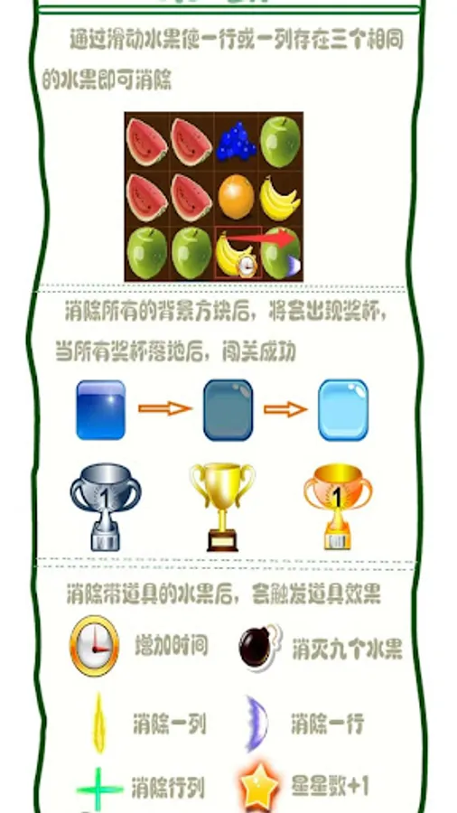 1. Slide the fruit so that there are three or more identical fruits in a row or column to achieve fruit elimination