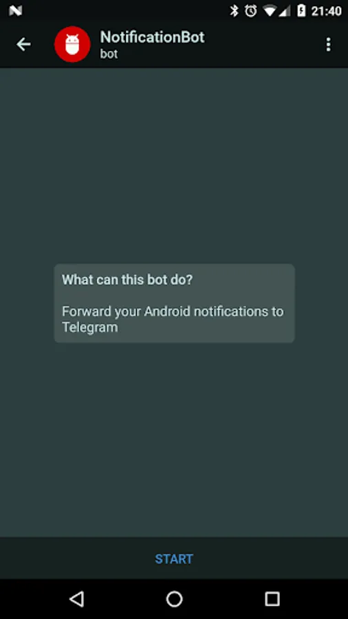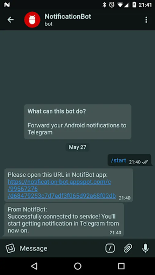 After connected your Android app and the Telegram bot, you can get Android notifications on Telegram.