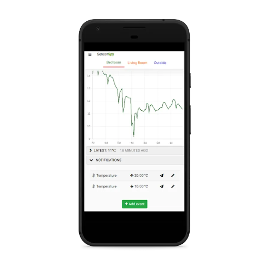 Create events based on the data send by your devices and have SensorSpy send you push notifications or call a webhook to integrate with other IoT applications