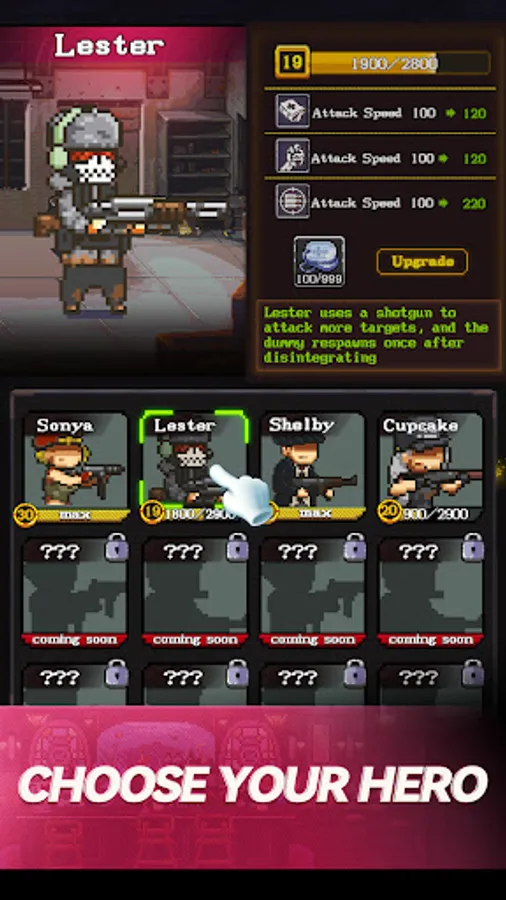 Zombie Fighter is a pixel survival game, gear to alive. Choose your hero and weapon as you want to defense zombies, fight with them while avoiding their attack. Using your strategy to select talent and upgrade your equipment to the next level.
