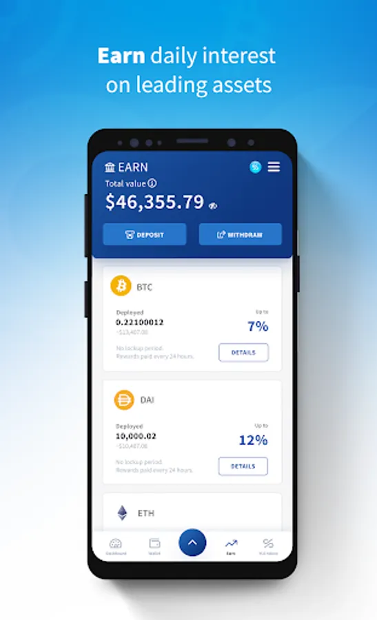Earn market-leading yield on Bitcoin BTC, Ethereum ETH, USDT, USDC, TUSD and DAI.