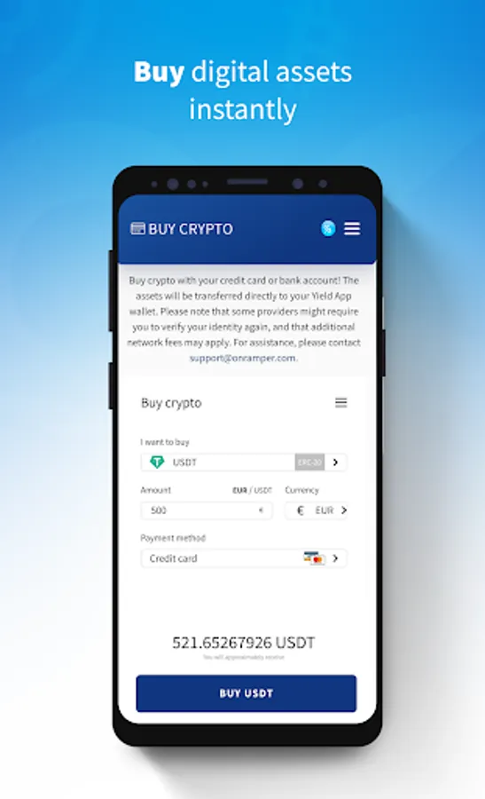 Our comprehensive systems allow you to buy cryptocurrency at the best possible prices using your credit card or debit card or simply transfer your crypto assets directly into your wallet and begin earning. You can also swap or exchange to different crypto assets and fiat directly on Yield App.