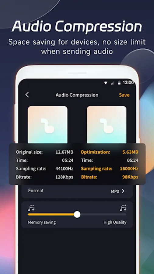 Compress or reduce the size of the audio with no compromise in the good quality.