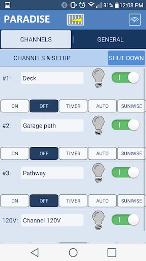 - 5 settings for each channel: On, Off, Timer, Auto, Sunwise
