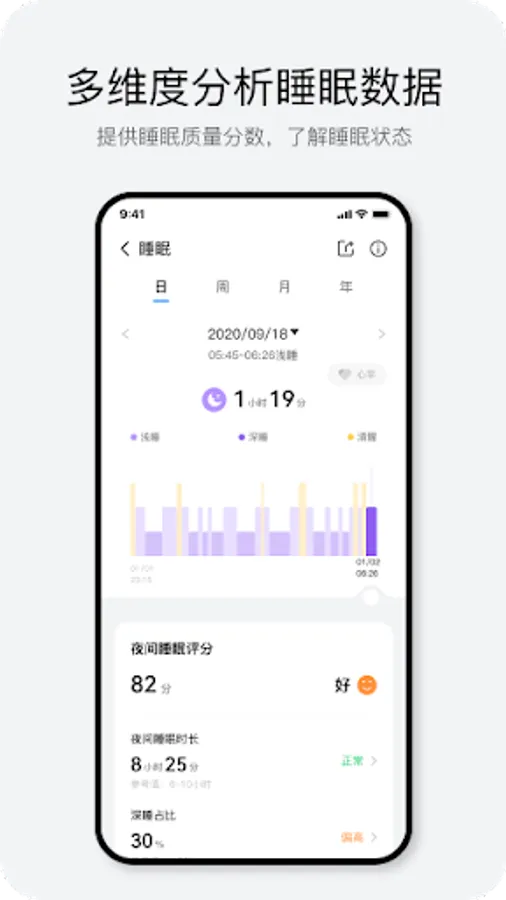 Record sleep information every night, analyze your sleep quality score by analyzing the proportion of different sleep in sleep, and provide corresponding sleep analysis and suggestions.