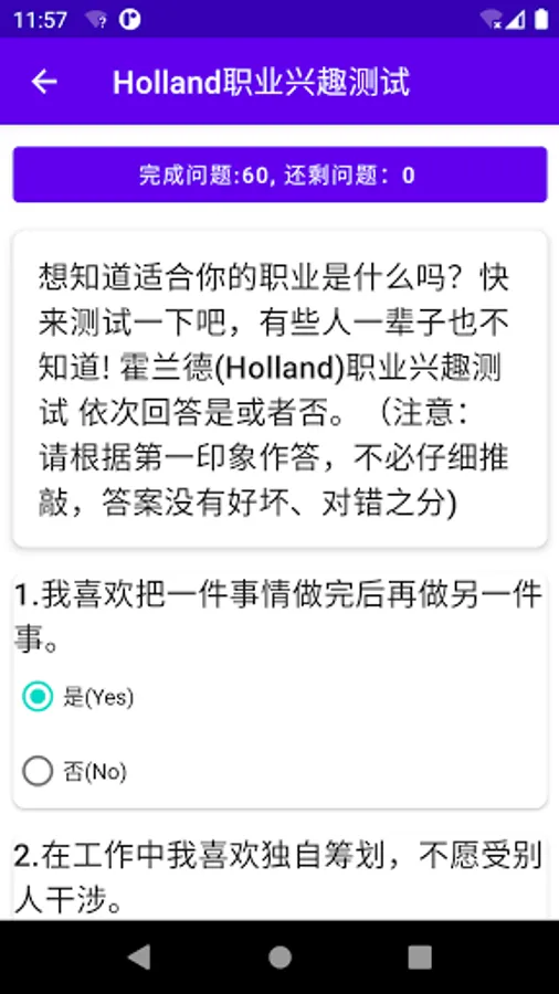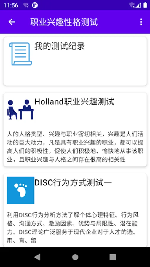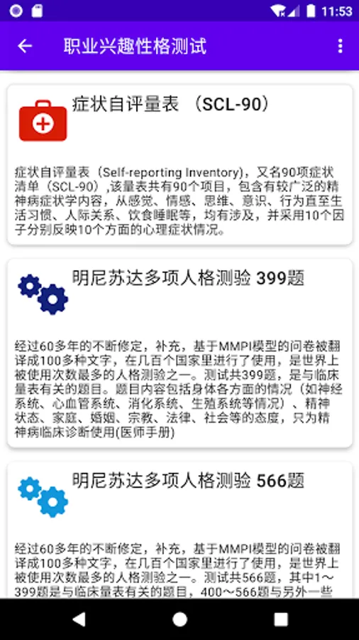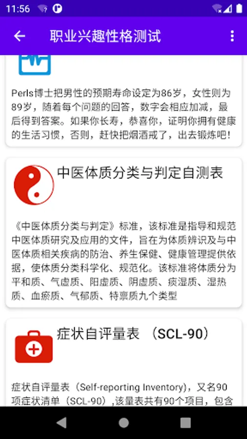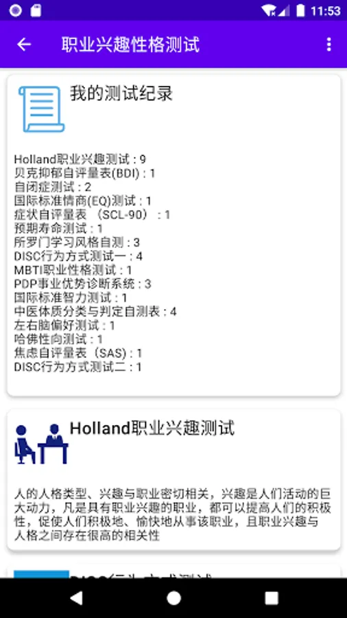 1. Choose the type of occupational interest scale, PDP, DISC, MBTI, left and right brain preferences, standard intelligence, life expectancy, standard emotional quotient (EQ), symptom self-rating scale (SCL-90), learning style, anxiety self-rating Scale (SAS), self-test for obsessive-compulsive disorder, social phobia.