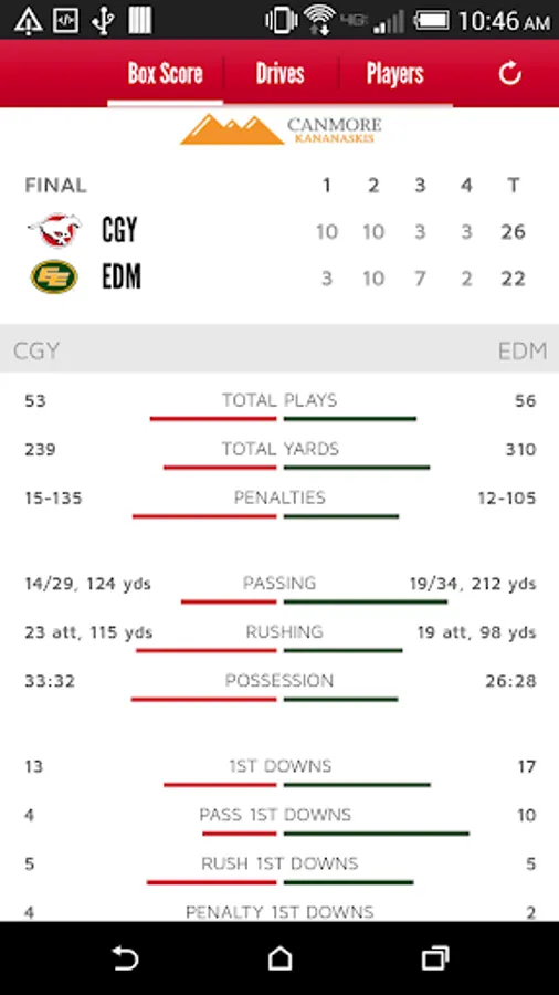 - Stats: Real-time statistics and scores from the official CFL stats engine, head-to-head stats of the matchup, player stats, drive-by-drive stats, box score, out-of-town scores around the league