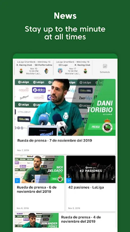 Multimedia content: See all the goals and highlights of the matches with the best multimedia content prepared specially for you. Access summaries with all the details: goals, skills, saves and the best moves by Racing de Santander in the 2019/2020 season and from previous seasons. Relive the legendary moves and recall the best goals by your favorite players.
