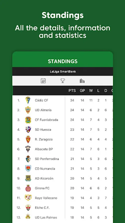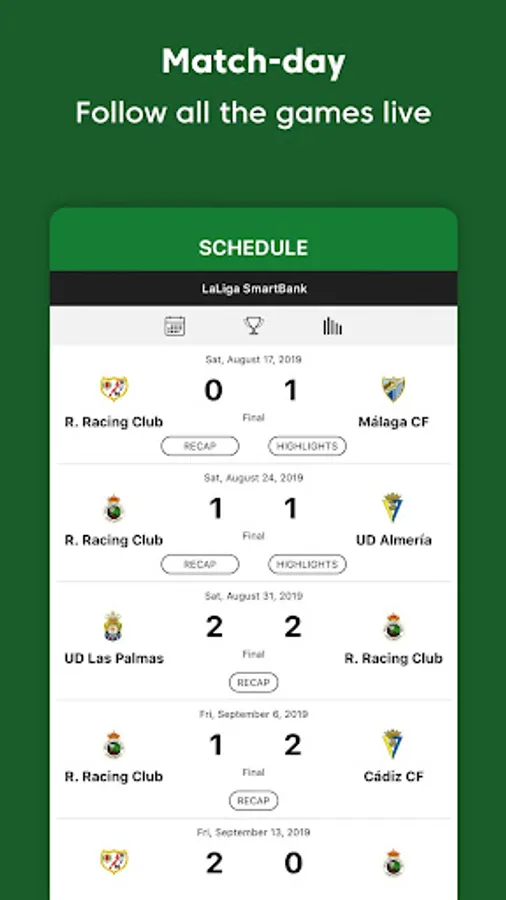 Calendar, live results and classification: Check all the key dates and timetables on the official calendar for all competitions for Racing: LaLiga SmartBank and Copa del Rey. Get the live results from every game on match day, with the league table fully updated at all times. Stay in touch every second with what is happening in every game with live updating information.