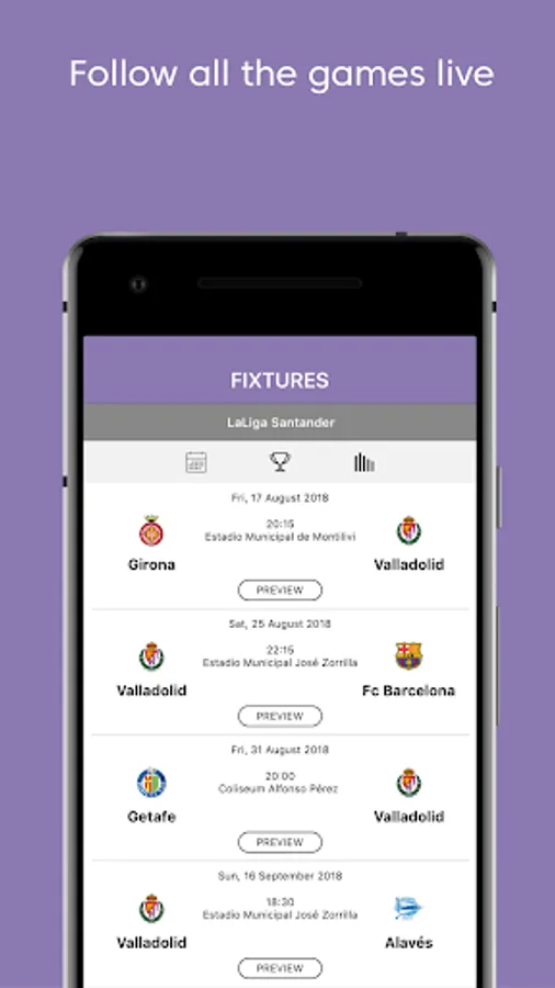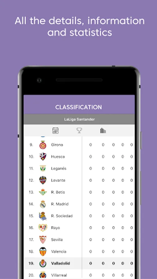 Calendar, results and live standings: check all the key dates and schedules in the official calendar for all Real Valladolid CF competitions: LaLiga, Copa del Rey,... All the matchdays with live results of each match and the general classification are completely updated. Follow instantly what is happening during all the matches with live updated information.