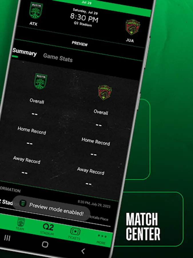 For visitors to Q2 Stadium, the Austin FC app is where you'll manage tickets and find matchday and event information, while keeping up to date with the latest player stats, season schedule, league standings and more.
