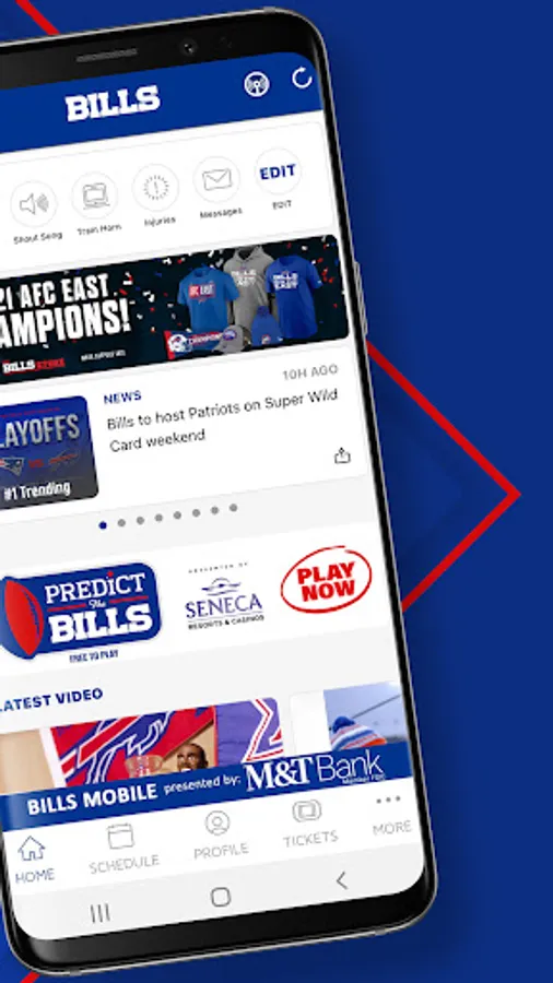 Welcome to the official mobile app of the Buffalo Bills, presented by M&T Bank and tailor-made for the most passionate and knowledgeable fanbase in the NFL. Stay locked in with exclusive team content all year long and make game day go smoothly with mobile ticketing. Plus, score live streaming video, breaking news, real-time statistics and drive updates, and on-demand highlights!