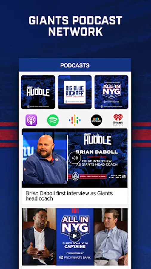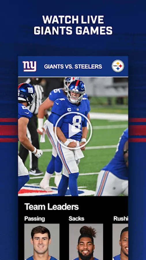 The New York Giants official mobile app is your destination for all things New York Giants. The updated mobile app includes the best Giants highlights, news, videos, photos, and podcasts. Here are some of the top features in the Giants mobile app:
