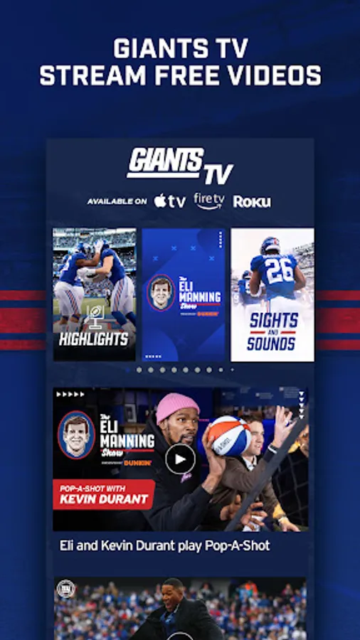 GiantsTV: Stream exclusive videos with GiantsTV, available for free inside the Giants Mobile App and also on AppleTV, Amazon FireTV, and Roku. Visit Giants.com/giantstv.