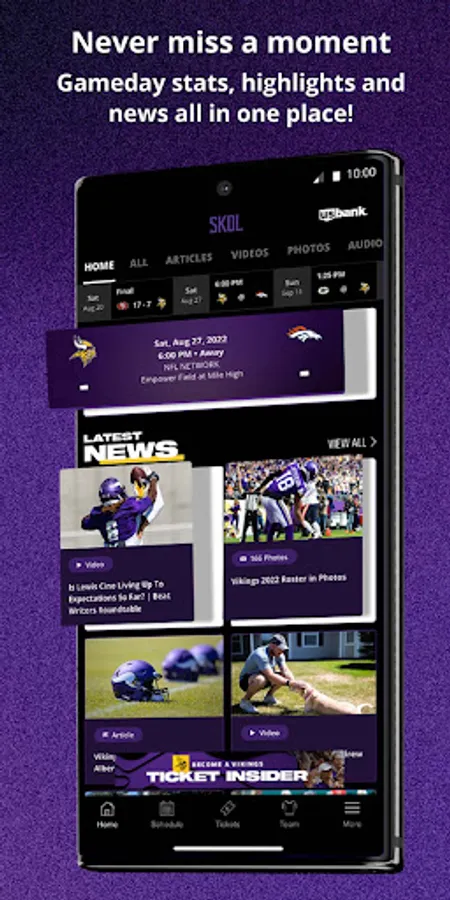 Featuring all the best content from the Vikings Entertainment Network, including the latest articles, videos, photos, and podcasts about the Minnesota Vikings. Download and view your tickets to a game, see gameday offers, get directions and parking to the stadium and more. Turn on push notifications to be the first to get breaking news about the team and choose what topics you would like to be alerted about when the next segment drops.